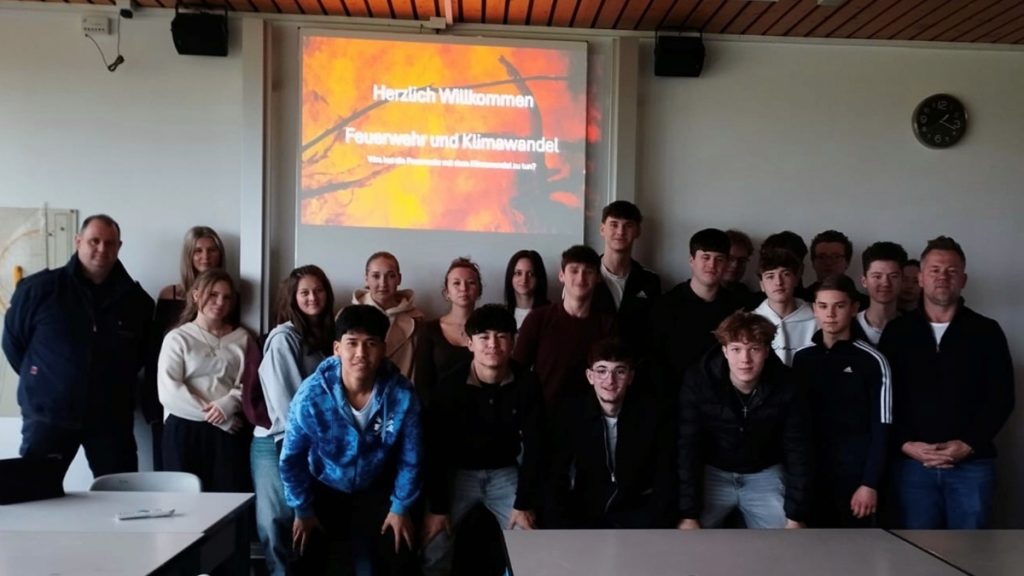 Die Feuerwehr ist rund um die Uhr einsatzbereit, um Menschen zu helfen und Gefahren zu bewältigen. Zu ihren wichtigsten Aufgaben gehören das Löschen von Bränden und die Unterstützung bei Überschwemmungen. Am heutigen Donnerstag (03.12.2025) informierte der erfahrene Feuerwehrmann Benjamin Grefe in einem 90-minütigen Vortrag die Klasse 10 b mit interessanten Berichten aus der Praxis. Auch die Häufung von Extremwettern als Folge des Klimawandels merkt die Feuerwehr. Herr Grefe berichtete von abgepumpten und überfluteten Kellern, von der Sicherung von Gebäuden und der Evakuierung von Menschen.
